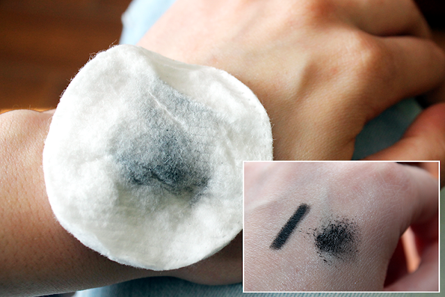 Não tenho razão de queixa no que toca à função de limpeza. Aliás, para vos mostrar a sua eficácia, fiz um pequeno teste com máscara de pestanas à prova de água e eyeliner e o produto conseguiu retirar a maquilhagem.